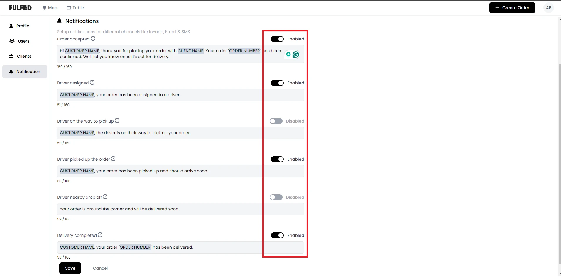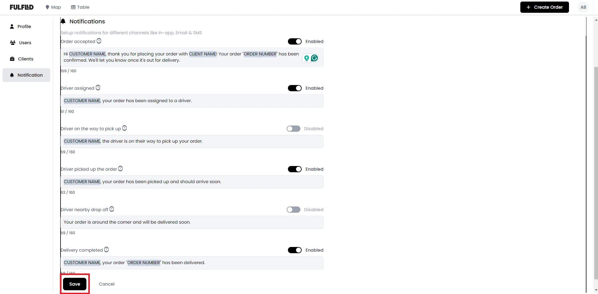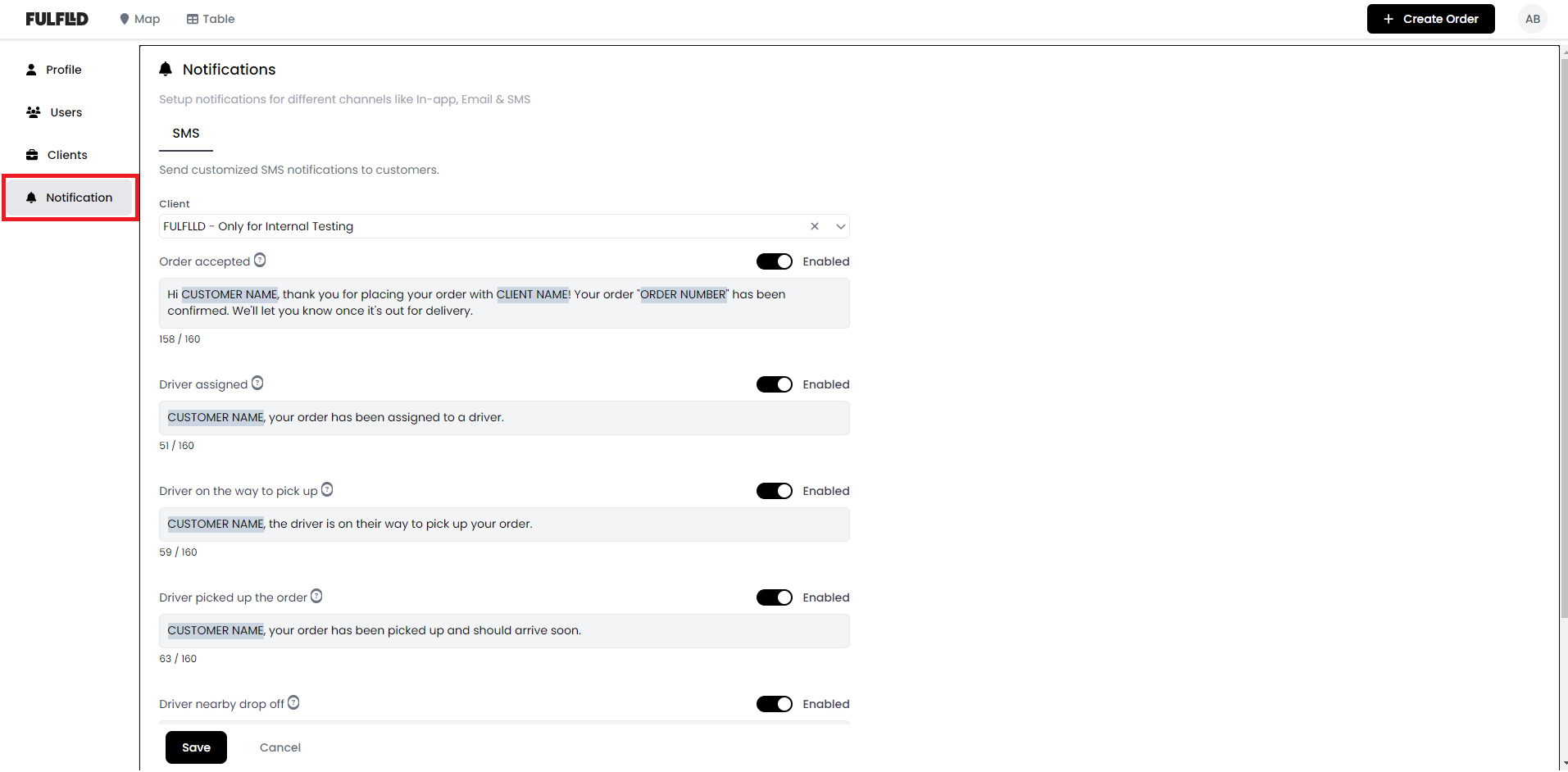 When you navigate to the Notification setting’s page, you will see all the events with their default SMS notification text.