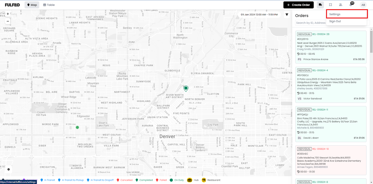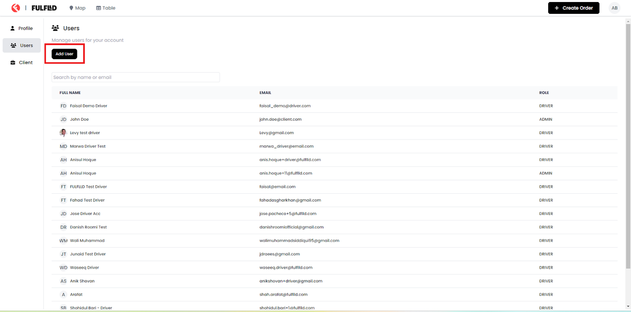 Admins and dispatchers can manage users from the settings page, https://app.fulflld.com/settings. They can add users to the platform, and assign roles to them following the steps below.