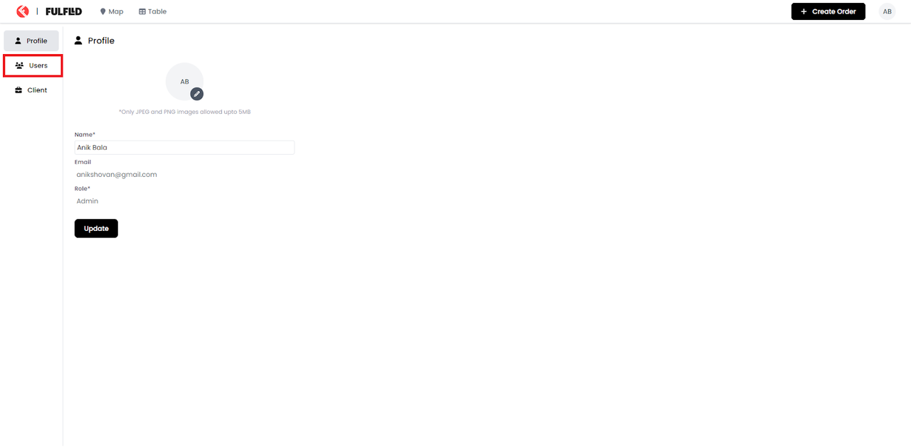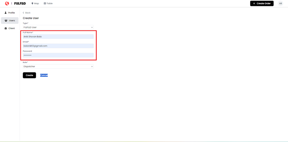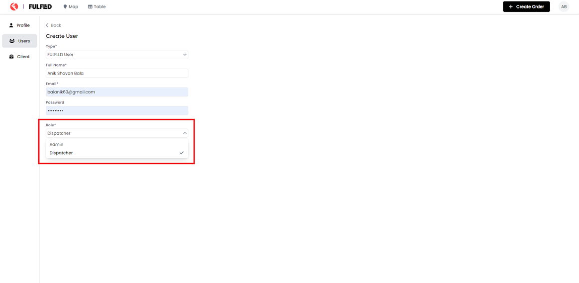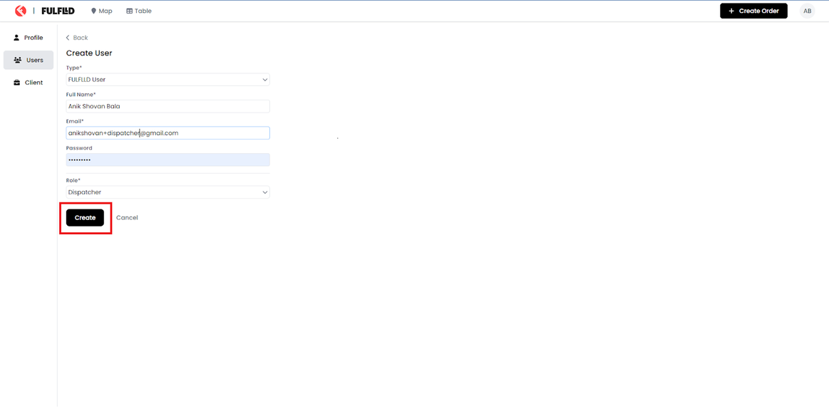 After creating the user, you will get a successful notification on top of the screen and you can search the user in the user list. share the credentials with the user and they will be able to login to the platform from https://app.fulflld.com/.
